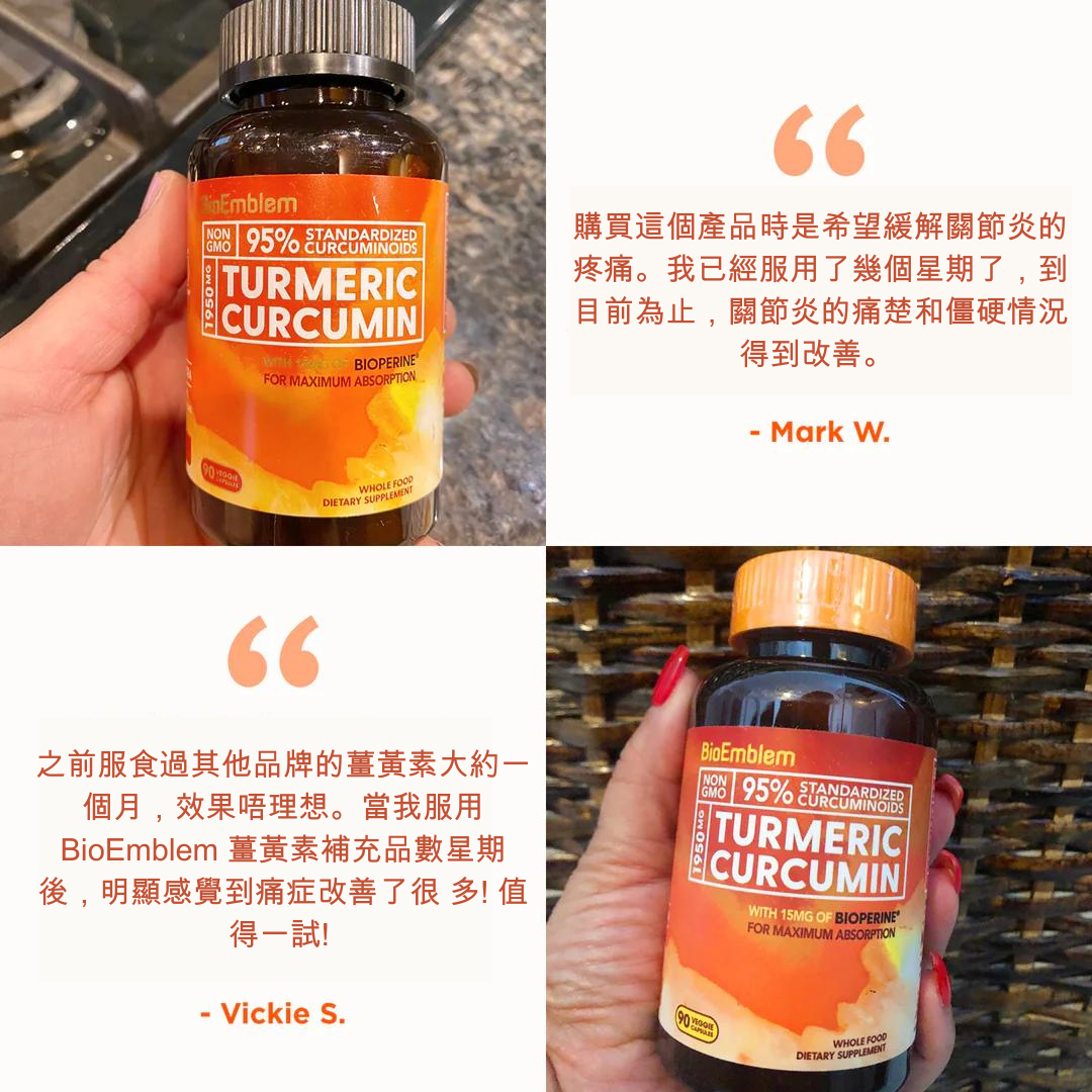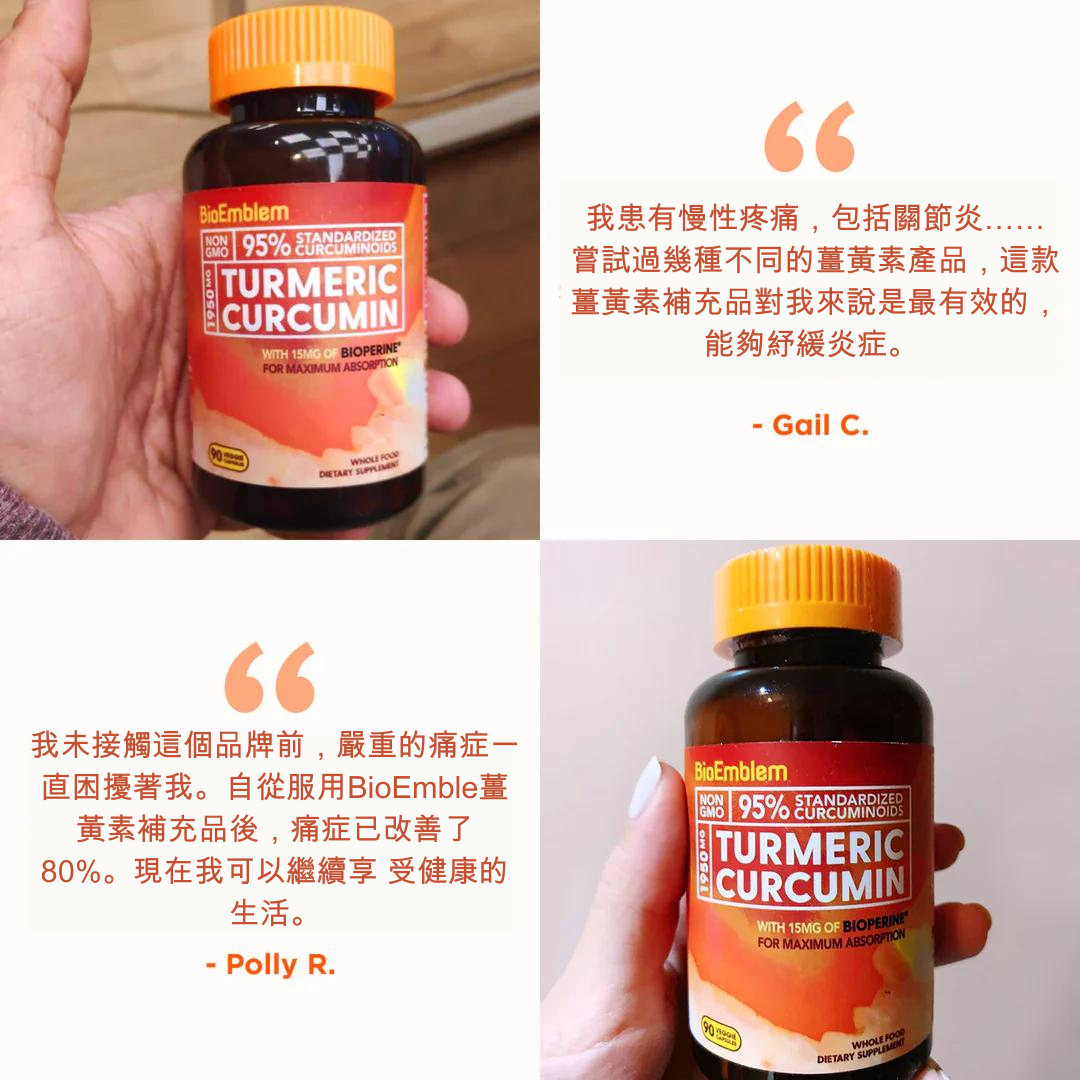BioEmblem 設計及研發出一種獨特的成分混合物,以改善生物利用度,令身體更容易吸收,並加強對身體帶來的好處。 - 95%符合標準化薑黃素提取物: